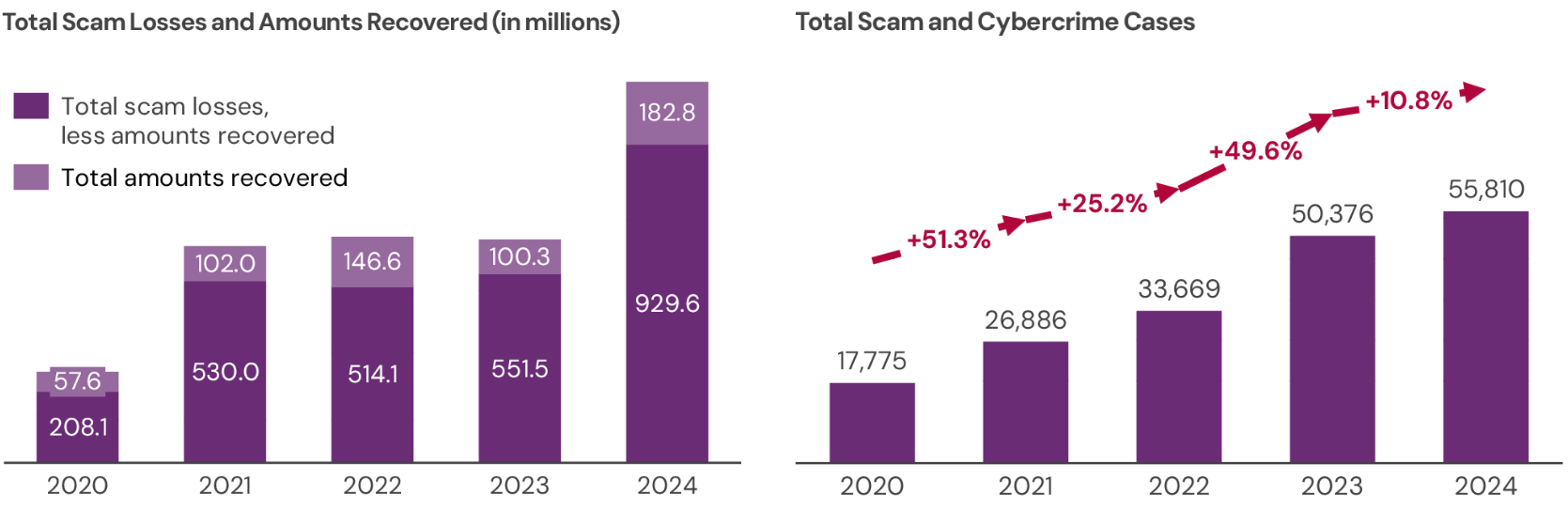 Hitting closer to home, a recent Financial Times article described Singapore as being amid a “scamdemic”, having seen a 70% rise in the value of money lost to online scams amounting to S$1.1bn in 20245. Scam victims in Singapore suffer some of the highest financial losses in the world5, but what remains unquantified is the consequent trauma and social cost of victims handing over their life savings to fraudsters.